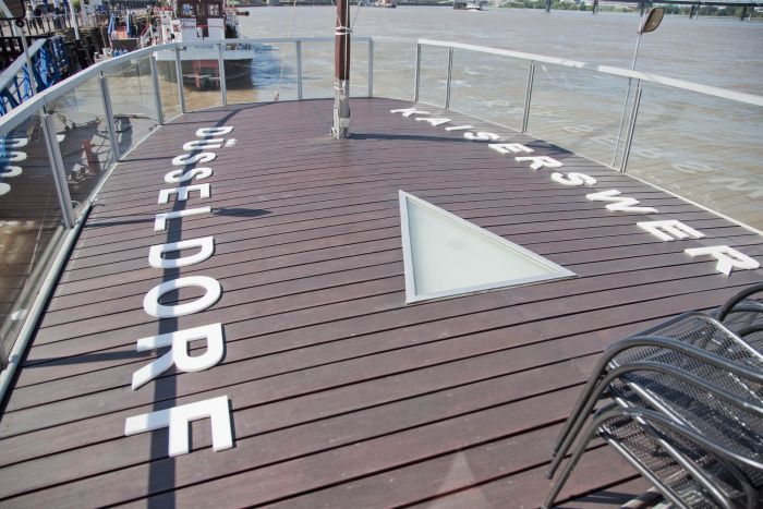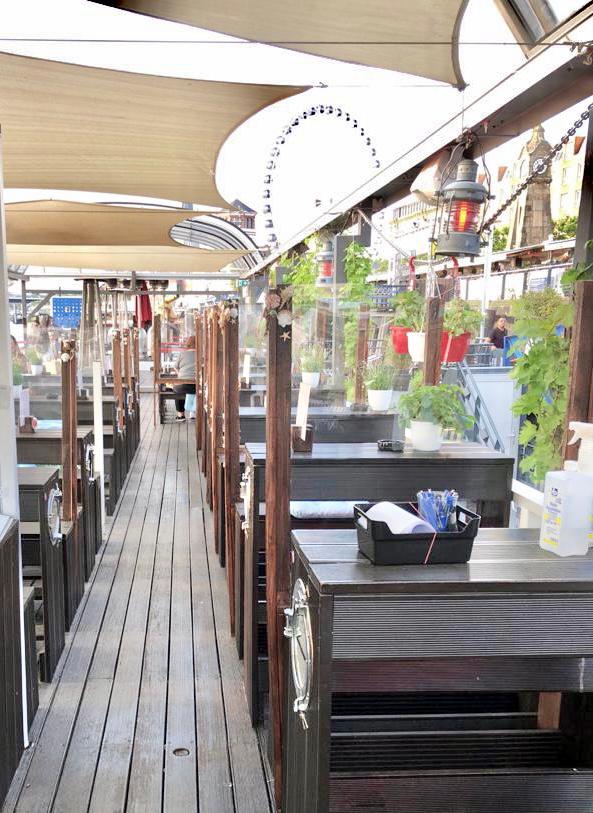 Nun liegt unsere alte Dame seit fast 20 Jahren fest vertäut vor dem Ufer der Altstadt und wird gerne von Flaneuren und Stammgästen auf ein kühles Bierchen oder Aperitif zum Sonnenuntergang besucht. Je nach Wasserstand kann der Auf- und Abstieg schon einmal mühselig sein. Man beachte die Technik der High-Heels Trägerinnen! Der Geist der vergangenen Jahre scheint an manchen Abenden noch an Bord zu sein. Oft sieht man Ihn im Steuerhaus!