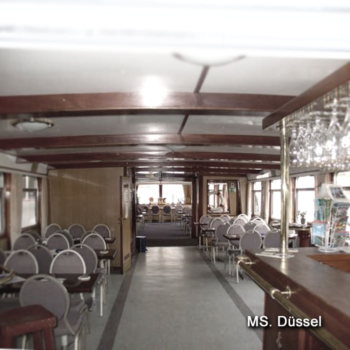 Die MS. Düssel ist liebevoll gestaltet mit sehr viel Holzdekorationen und im rustikalen Stil gehalten. Für den Charterbetrieb für bis zu 130 Personen geeignet. Ein großes und sehr schönes Freideck mit Sonnensegeln heckseitig und ein kleines am Bug bieten den Gästen ein schönes Panorama auf dem Wasser.